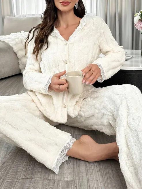 بيجامة دانتيل وقطيفة – رقبة V ستايل أنيق ودافي 🍂❄️